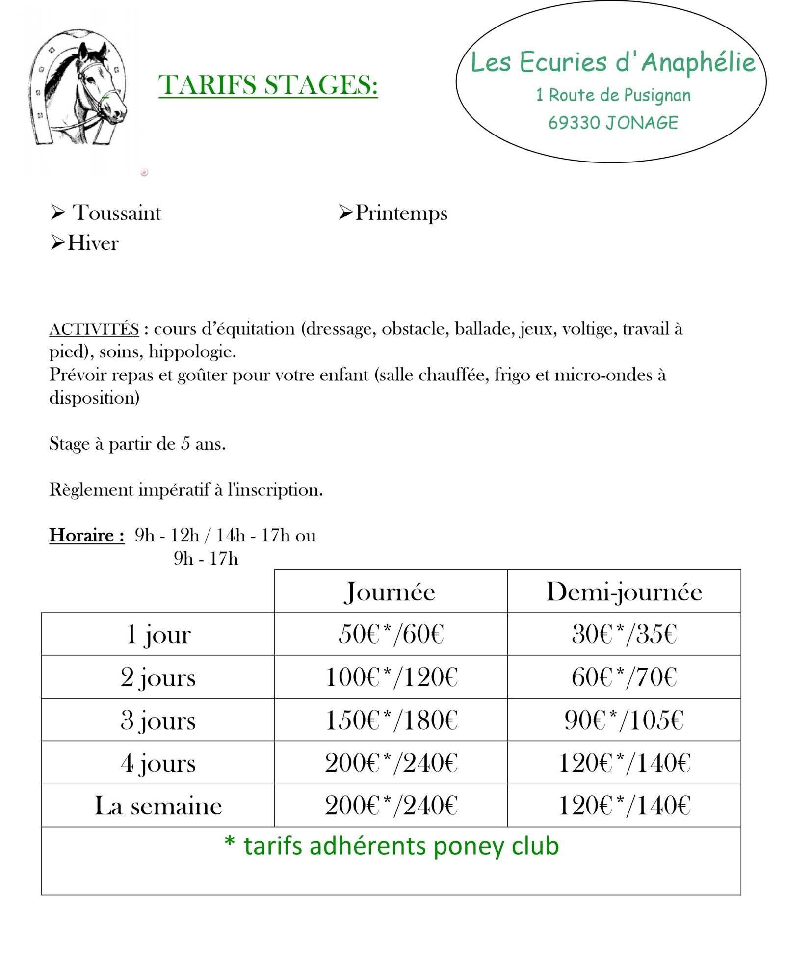Cours d’équitation (dressage, obstacle, ballade, jeux, voltige, travail à pied), soins, hippologie.
